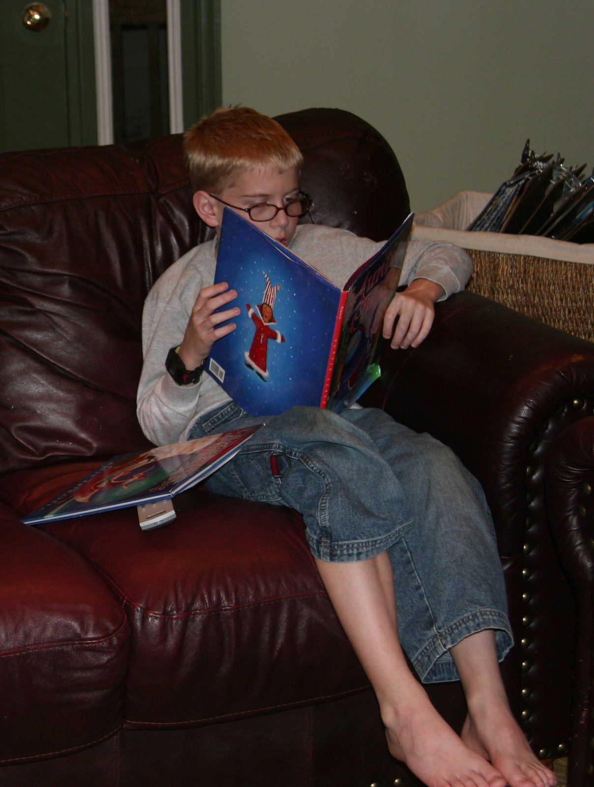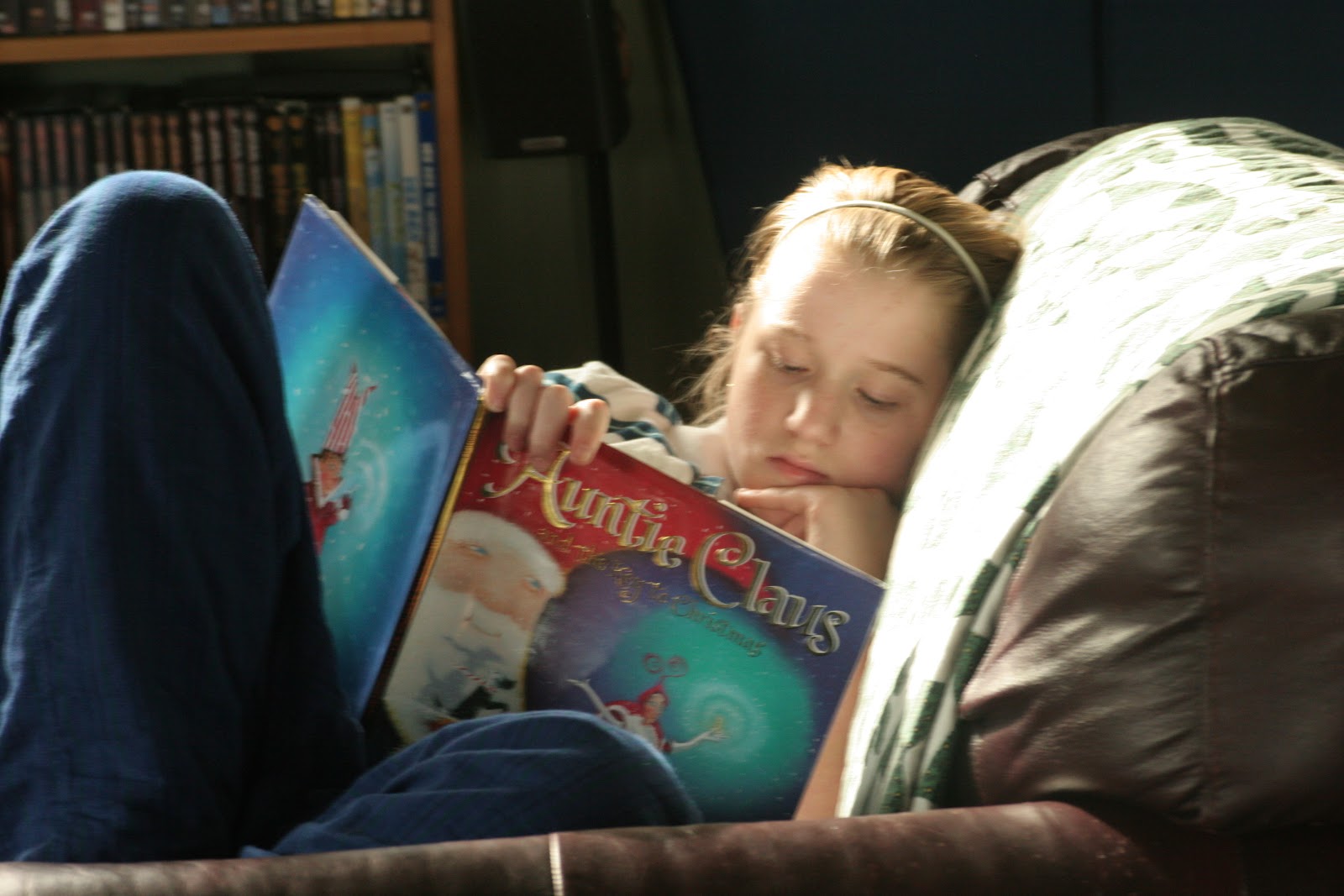 Okay, so these are the moments that make all the challenges of mothering worth it. We got our lovely tall Christmas tree yesterday, got out the ornaments, put out the nativities, hung some garland, and generally made the house festive. In the midst of it all, one of the things Evan and Sara paid most attention to was the stack of christmas books that are always under our tree. They get stored all year with the decorations, so they are fresh every year. I started collecting them when Jeff was born. I captured these images yesterday while we were decorating and today after church. It is a sweet thing to catch your child in the glow of a sunbeam, curled up with a good book.