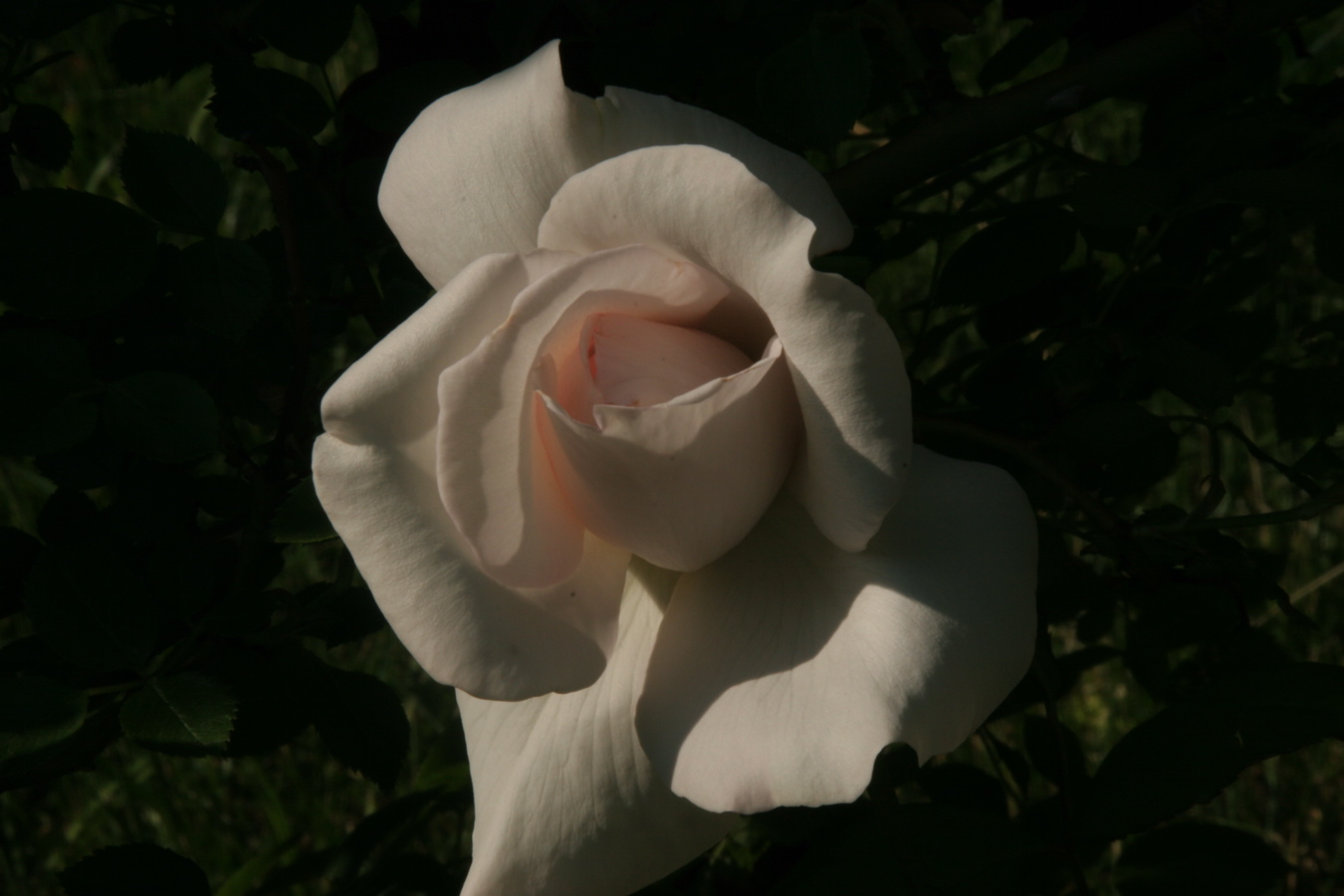 Moving around to the front, the only remaining rose from the previous owners of the house is this glorious specimen. I haven’t been able to identify it. It is a hybrid tea, I know that. It puts all its energy into producing a few spectacular blossoms each year, each one almost 5-6 inches in diameter and tinted the palest, most impossibly delicate pink. It has a luscious, classic rose scent. I treasure each one like a friend, then the bush succombs to the heat and humidity here and I prune it back to prevent black spot from killing it.