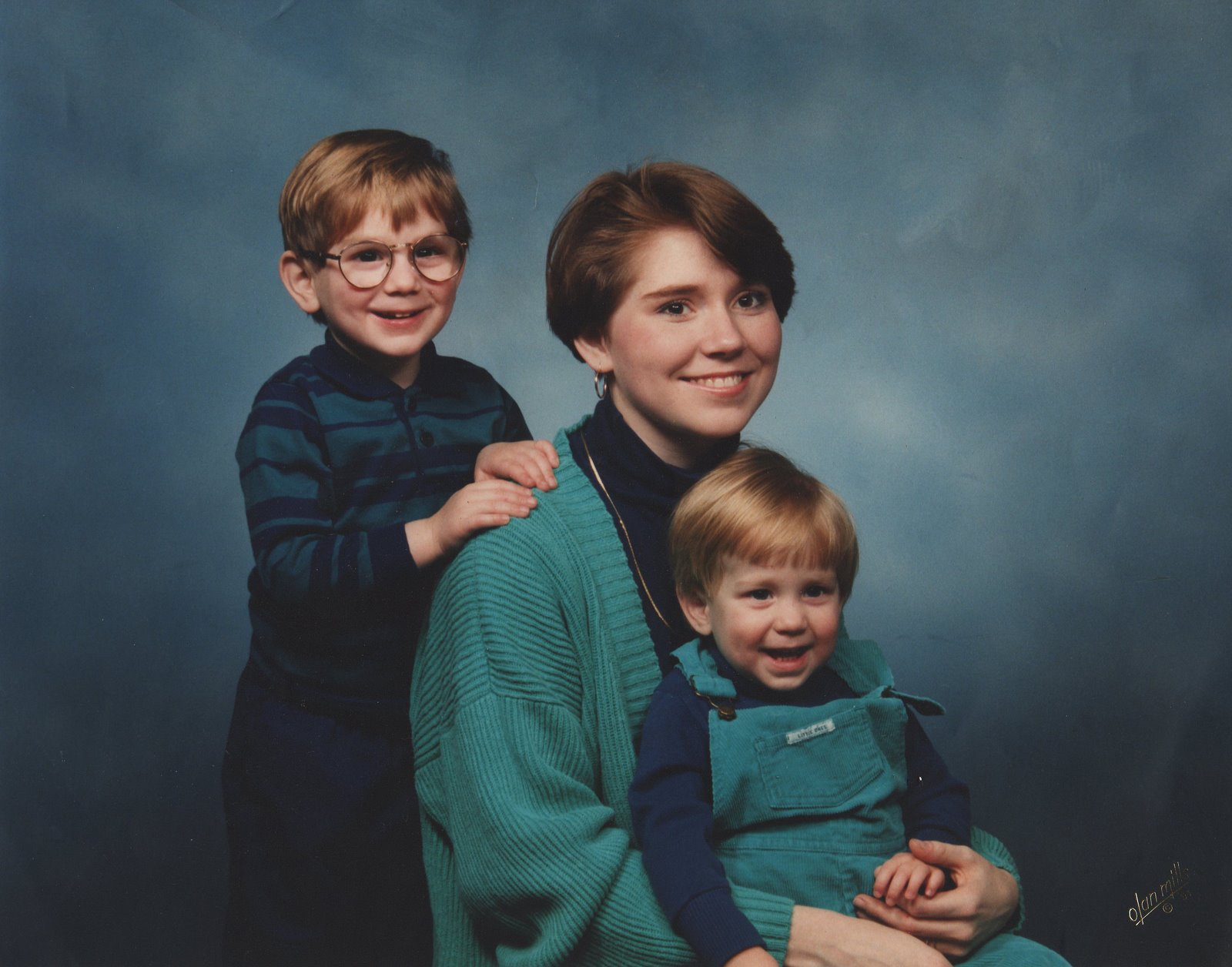 This was when he was about two. Jeff is 4. I was all of 24 going on 25 here. Johnathan has had every kind of hair-curly and very dark, dark auburn, straight, silky and bright red and here, fading to a lovely strawberry blonde and already so thick so as not to be believed in one so young.