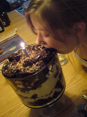 The rest of the day was spent cooking delectable ribs on the barbecue, then making yummy potato salad and curry-apple cole slaw so we could properly celebrate Sara’s birthday. The good news is that we have tons of leftovers, so dinner tomorrow is all taken care of! I am so happy about that. Evan had a boy scout fishing trip and came home excited but tired. Sara and my mom helped with dinner and cooking together all afternoon was fun. The crowning achievement of all our efforts was Sara’s choice of celebratory desert, Chocolate Toffee Trifle. So good she almost couldn’t wait.