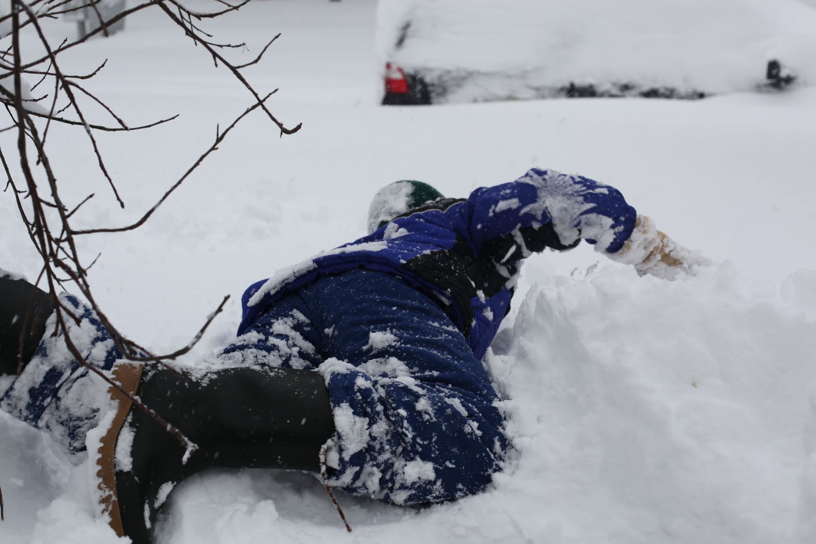 That is some awesome snow you have there. I love the pictures, especially the one of your son sitting in the snow. Cracked me up. 😀