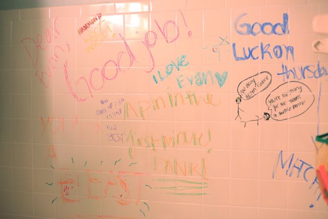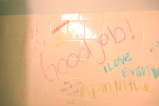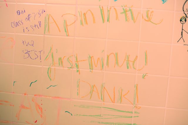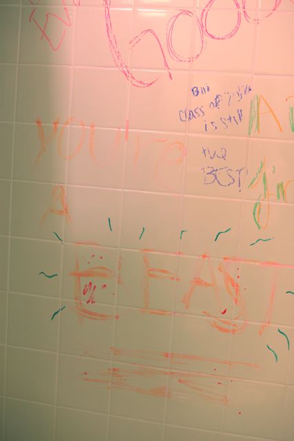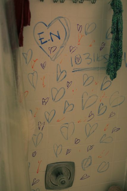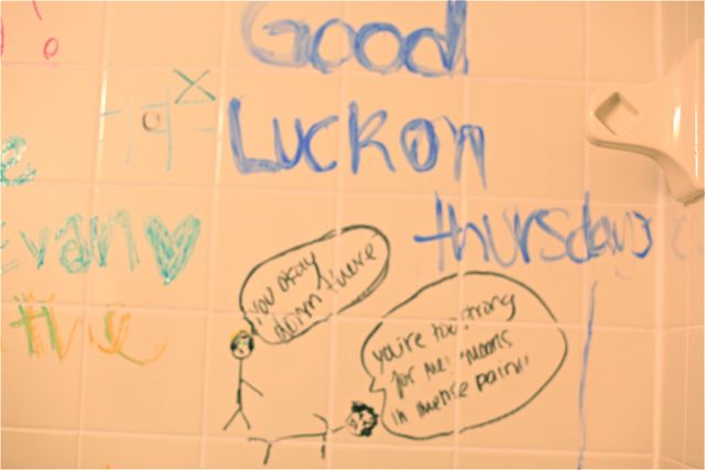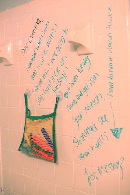 A couple of months ago, when I knew I was having some younger children coming to stay with me, I bought some washable tub crayons, just for fun. My own kids love them and the crayons have taken up permanent residence in the shower, yielding some fun results. My kids will have graffiti conversations with each other, games of tic tac toe, etc. The other night, Evan won a wrestling match with a pin in the first minute. The next morning, this is what I found in the shower: