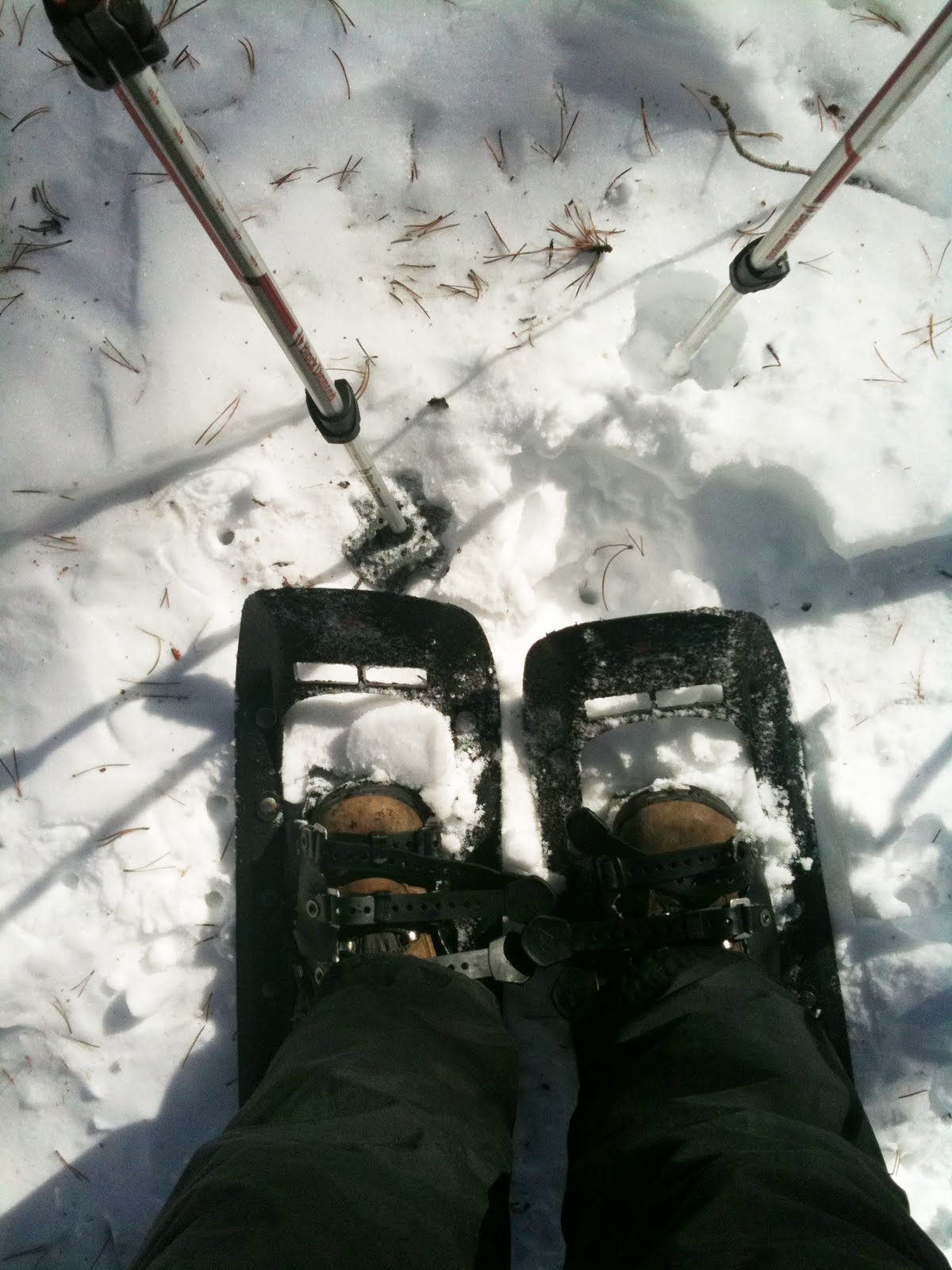 Here are my snowshod feet in the snow at 9000 feet elevation. Good times. The sound of the wind in mountain pines is wondrous.