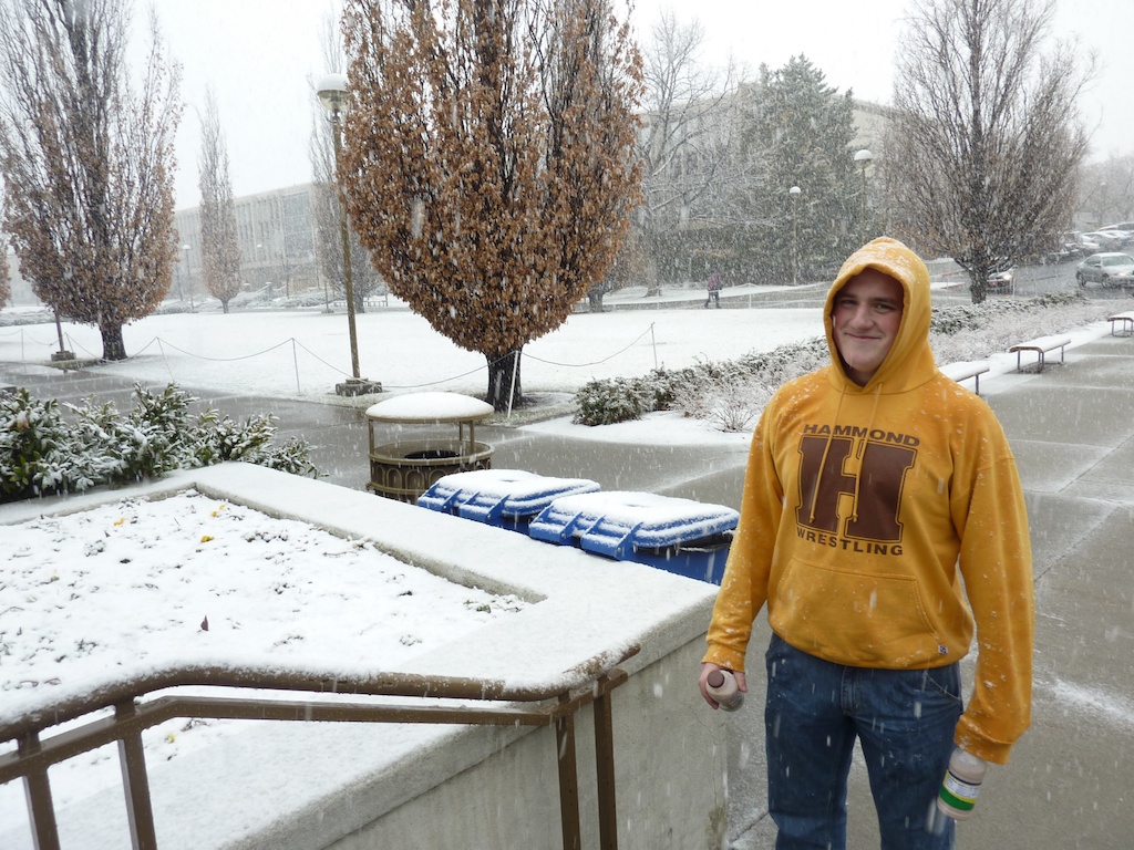 | Sam in the snow on campus |