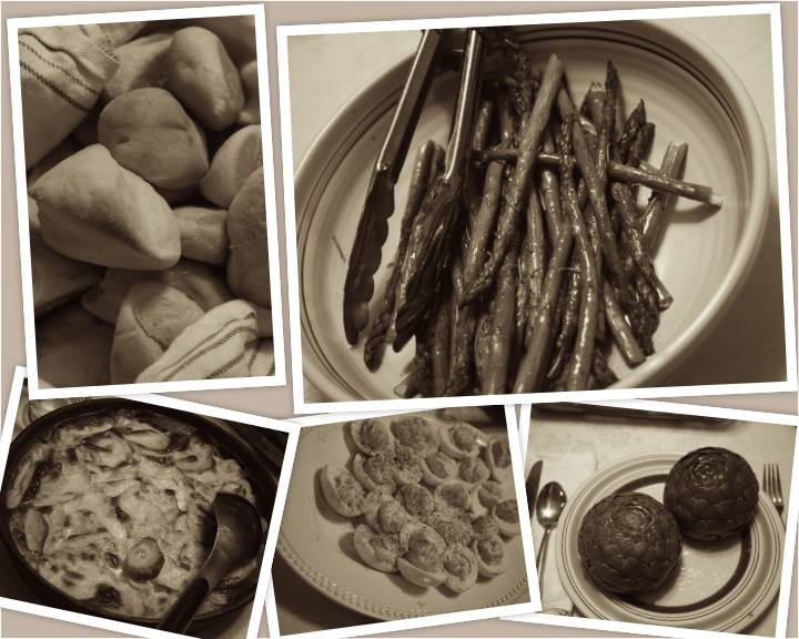 Our holiday dinner went off without a hitch-traditional with all the trimmings-Ham, scalloped potatoes, artichokes, asparagus, homemade rolls, deviled eggs, yum.