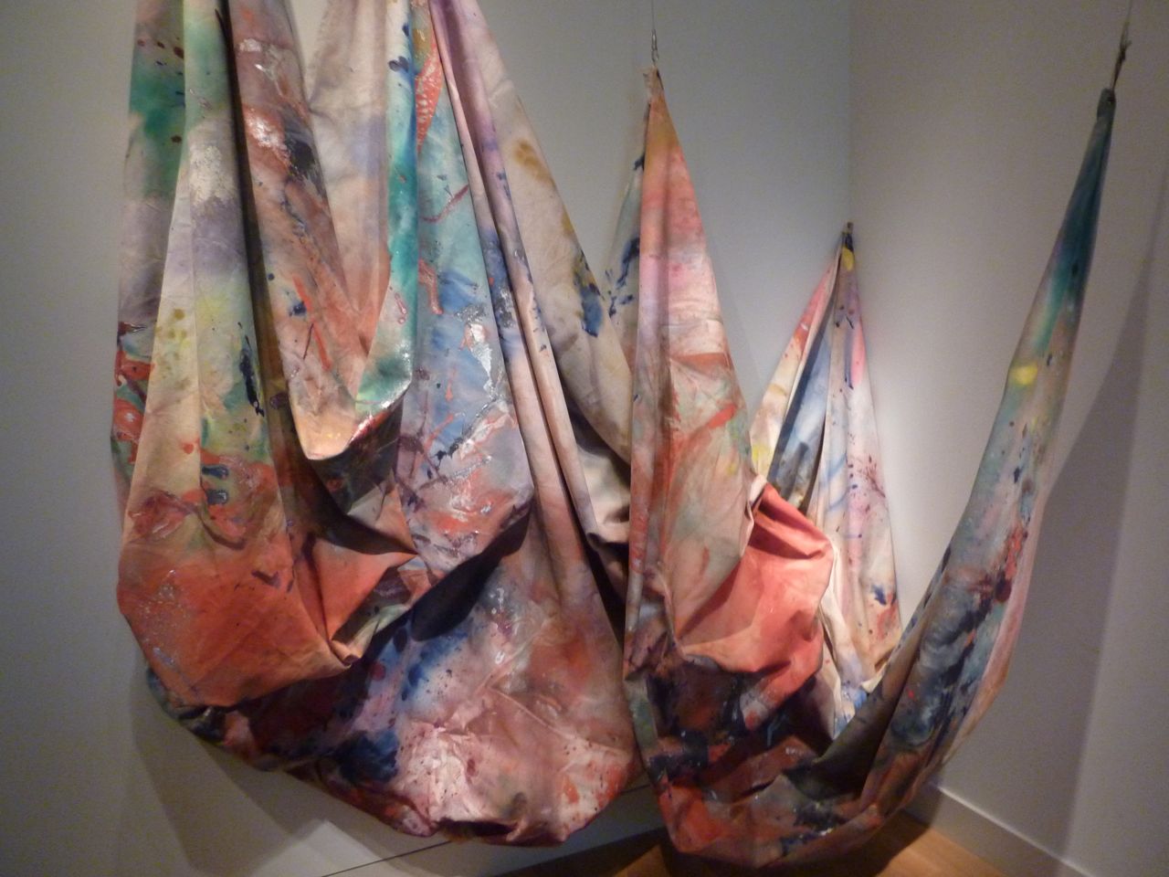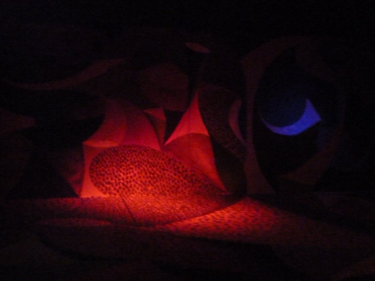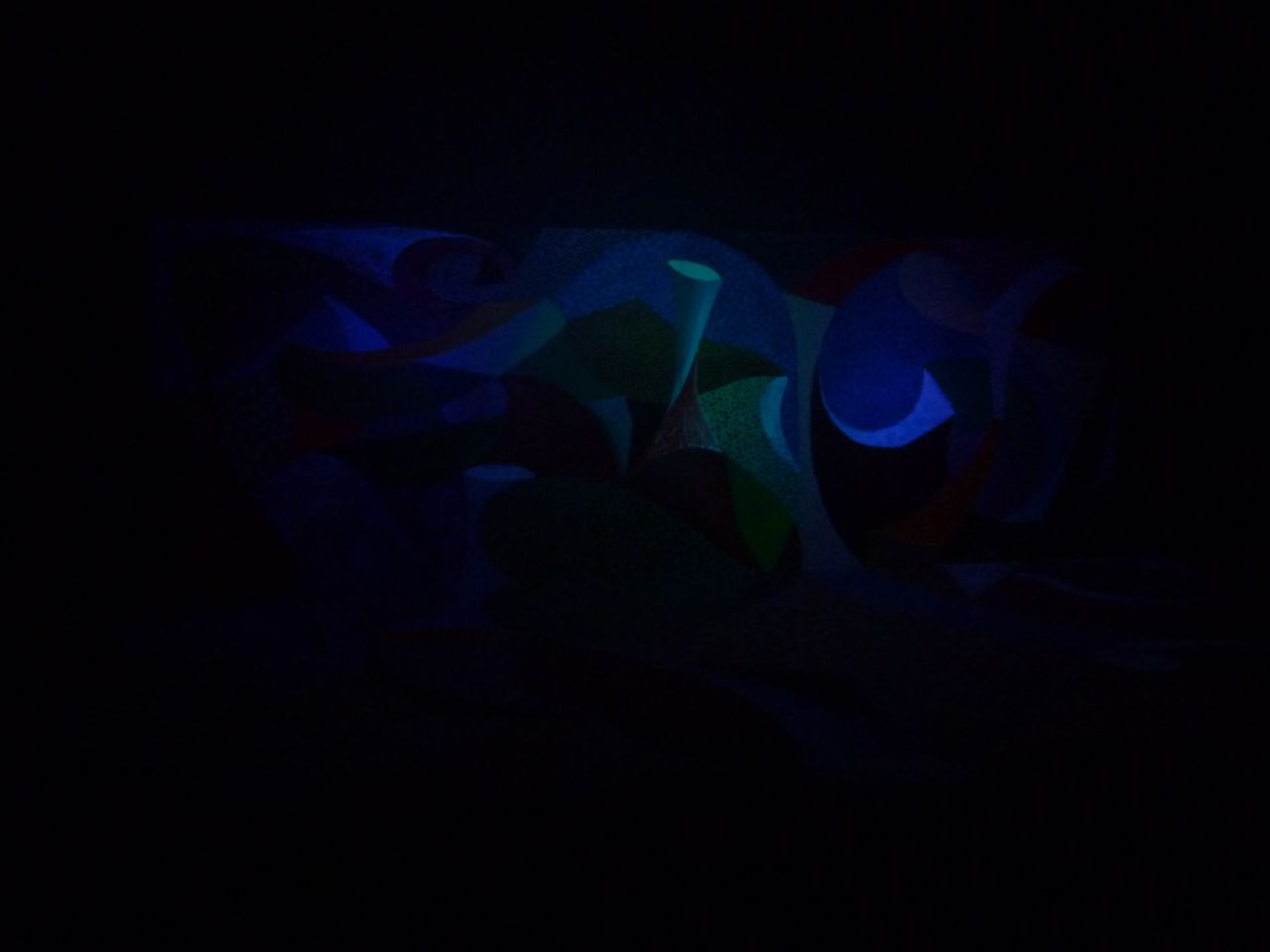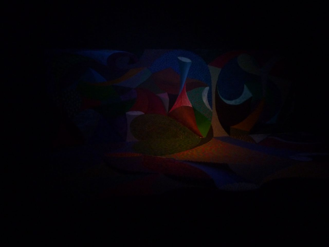 | This and the following two are of the same artwork. It is a painting done on the floor and wall of an entire room. This image shows that it is done in many colors. |