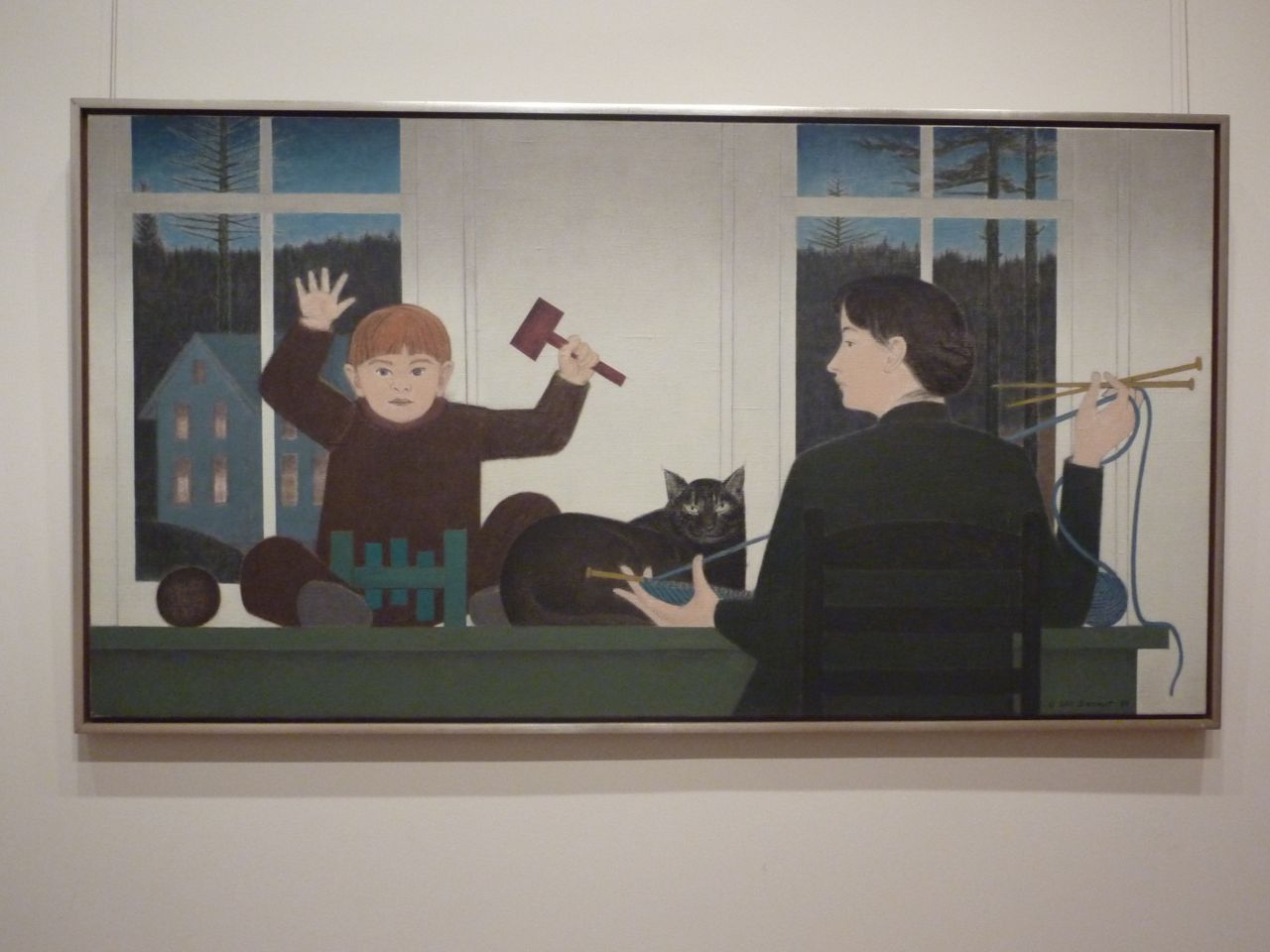 | Yay, knitting in fine art! But she appears to have three single-pointed needles in use at the same time, so either the artist made a mistake or she was doing something really unusual. |