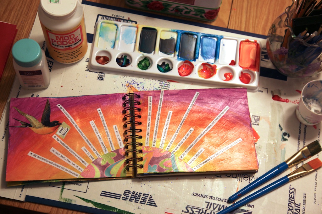 I work pretty hard to keep my overlarge right brain under control with things moving along in some sort of order, and sometimes I think that process makes me really tired. I keep to my lists and feel the pressure of getting everything done and just a bit of the twinkle goes out of my eyes because it’s so not my natural way. For this class, however, my less linear side got to be in charge. And just in case you were wondering, an unfettered right brain, a stack of art supplies and a jar of Mod Podge can have some serious fun. The eye-twinkling kind. I found the projects to be freeing in a way that really got me thinking about the ideas put forward in the class. Nothing taught was revolutionary or rocket science, but for me and my visceral, emotional self, it worked to get me thinking about some habits I’d like to break, some skills I’d like to put to better use, and some things to feel more settled and satisfied about. It worked better than just reading and making notes or watching a video. I had to work with my hands WHILE I was thinking about things, and stuff has started to sink in.