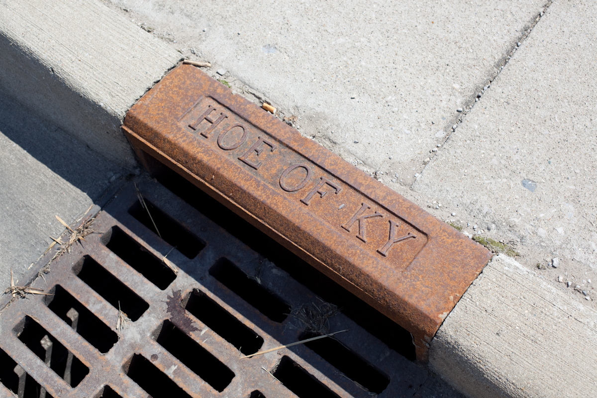 I have some trips to post about, some pictures I want to record here, and some things that I just want to write down, so hopefully I’ll be back soon, but I probably shouldn’t make any promises in case it’s another 2 weeks.  Here’s a preview of one of the trip posts, anyway. I went to Kentucky last weekend to see two of my sisters and this is one of the things I found affixed to a storm drain in that fascinating place. If you can tell me what it means, I’d love that. I’m sure I can google it, but I’m too tired right now.