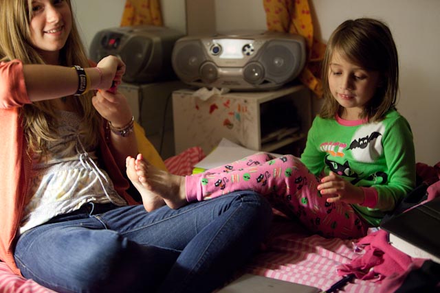 | Sara and O got some nail-painting time. O would call us, “My cousin Evan,” or “My Aunt Kellie.” It was very endearing. |