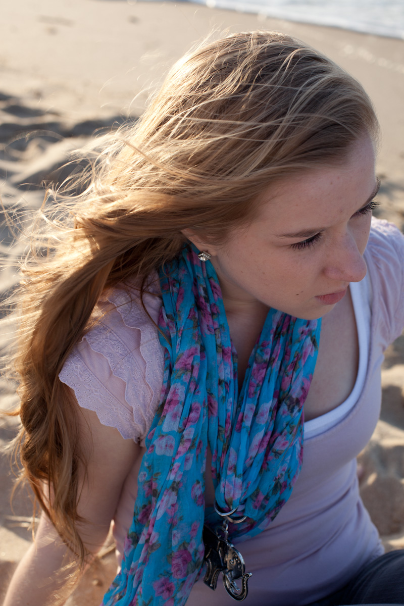 We took a few shots with the sun still high in the sky and discovered that the kite-boarders had ideal conditions for what they wanted to do, but for us, one thing was not so spot-on: the HUGE winds that were whipping along the beach. Oh my goodness. I would estimate it was a constant 20 mile an hour situation. Maybe more. (I’m right-I just checked. Sustained winds of 22 mph were recorded that day.) The ONLY saving grace is that the winds were blowing toward the west so when Sara stood with the sun at her back, the wind was nice enough to blow her hair back off her face. So, we did figure out how to get some nice shots.