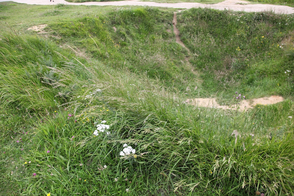 A bomb crater at Pointe du Hoc, grown over by grass and criss-crossed by the paths worn by visitors |