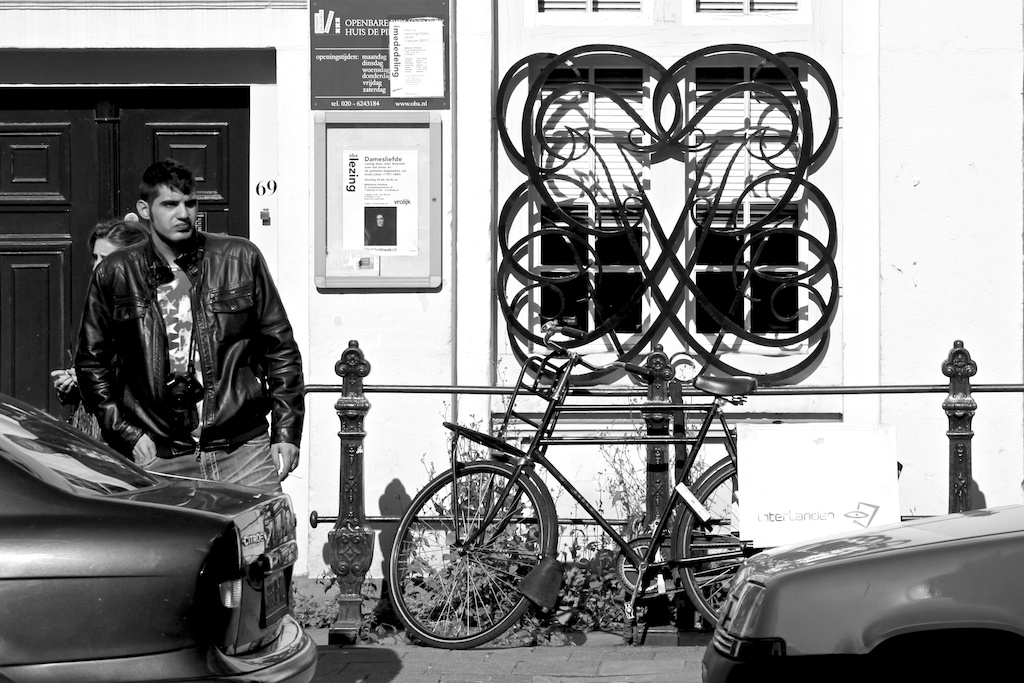 | More contrasts: the elegant window grate caught my eye, as did the exotic guy in the leather jacket. |