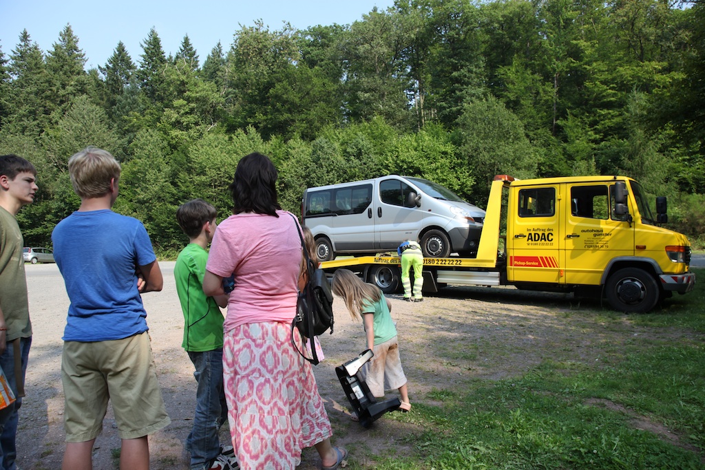 Our heroic driver secures the van to the wrecker while a very hot, tired crowd looks on. When he was done, we piled in for our 2-hour ride home in a very expensive Mercedes. Not exactly the Mercedes one dreams of, but we sure were grateful.