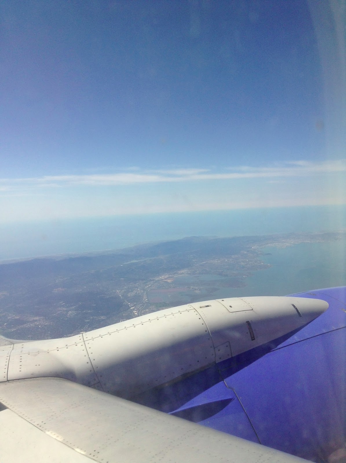 | Over San Fran. I could SEE the Golden Gate Bridge, but because of the thickness and angle of the airplane window, I could not get it in the frame. |