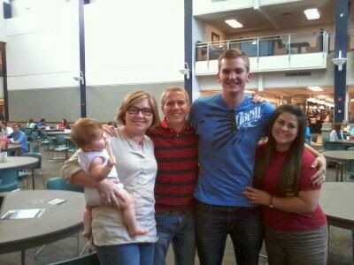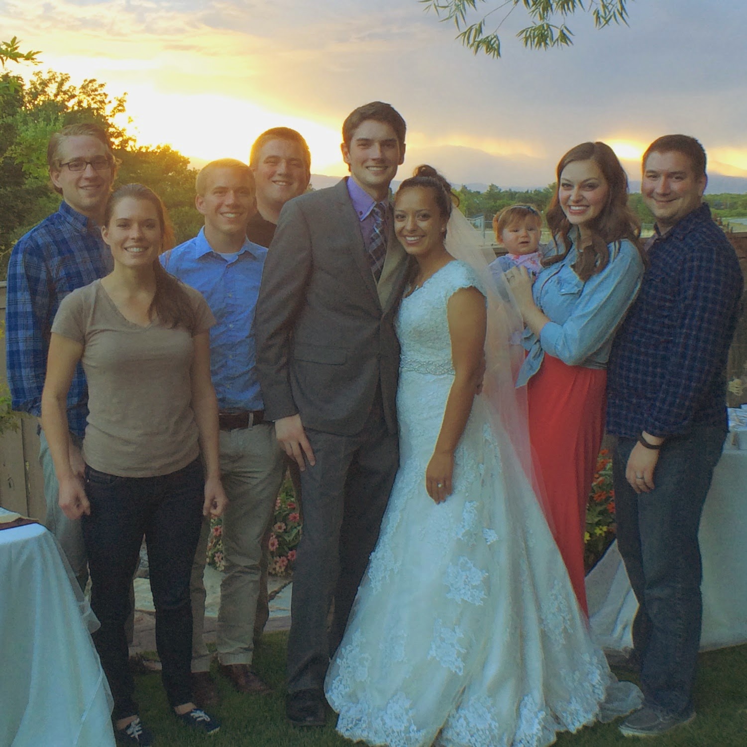 | A group of the older cousins, plus the very newest cousin. My kids, granddarling, and my nephew and his wife. We were at the nephew’s wedding open house all together. It was lovely. |