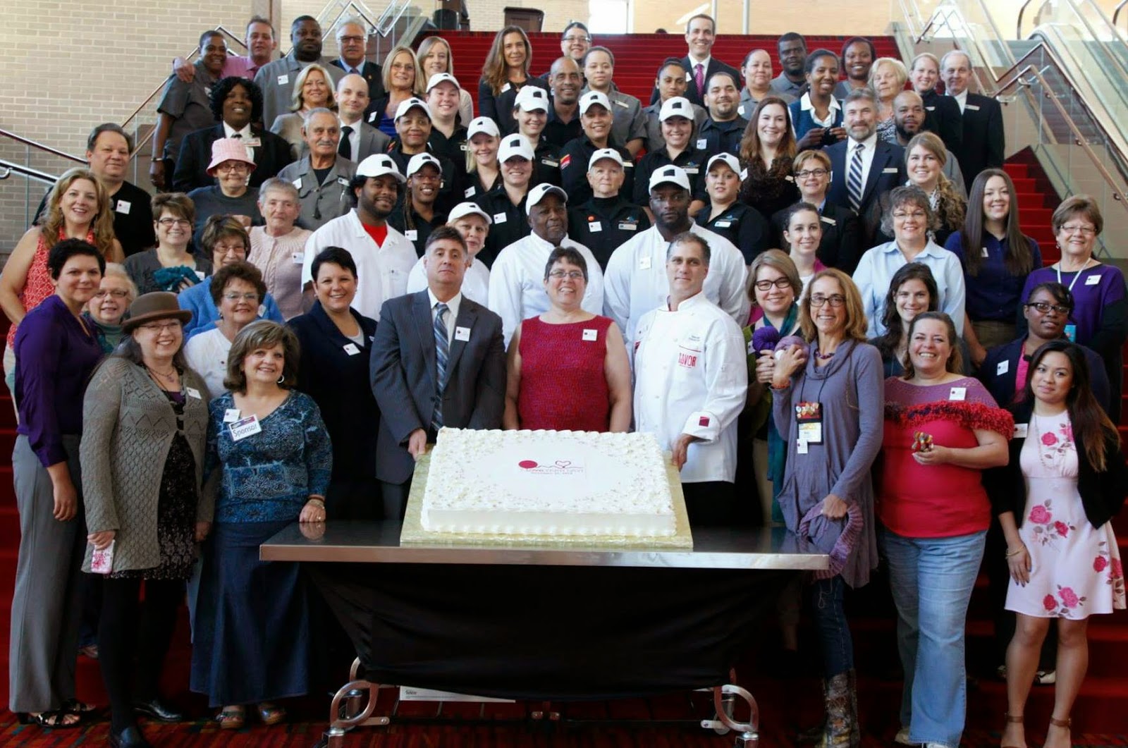 | It was I Love Yarn Day, so the convention center made us a CAKE! It was glorious. I’m there, within arm’s length of that icing. On the right, next to the pastry chef. Photo credit to Lisa Mannes |