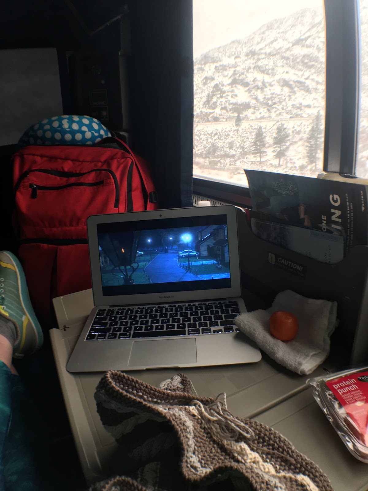 I loved the motion of the train, and waking up to the sunrise over the bleak Nevada wilderness was actually pretty spectacular. The rest of the morning was spent taking a shower (teeny-tiny, but reasonably clean, with fresh towels and hot water), getting my included breakfast (lots of choices–I had the steel cut oats and fruit), then returning to my now-converted room with 2 seats to watch the Sierra Nevada roll on by. I had Harry Potter movies queued up on my computer (there was no internet on this train–but I knew that so I’d downloaded beforehand) and had a lovely, relaxed day putting my feet up and knitting.
