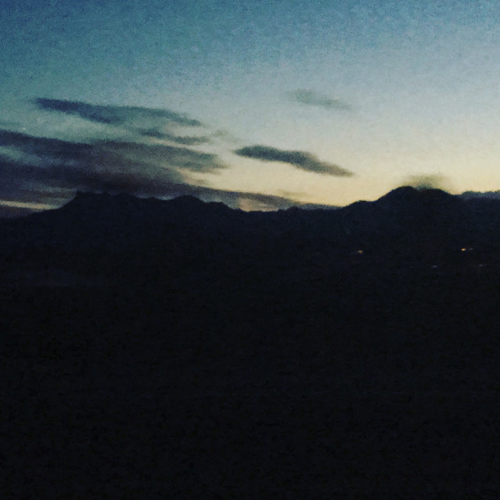 | This morning, I left before sunrise. This is my last glimpse of the Tortolita Mountains, where my parents’ house is nestled. |