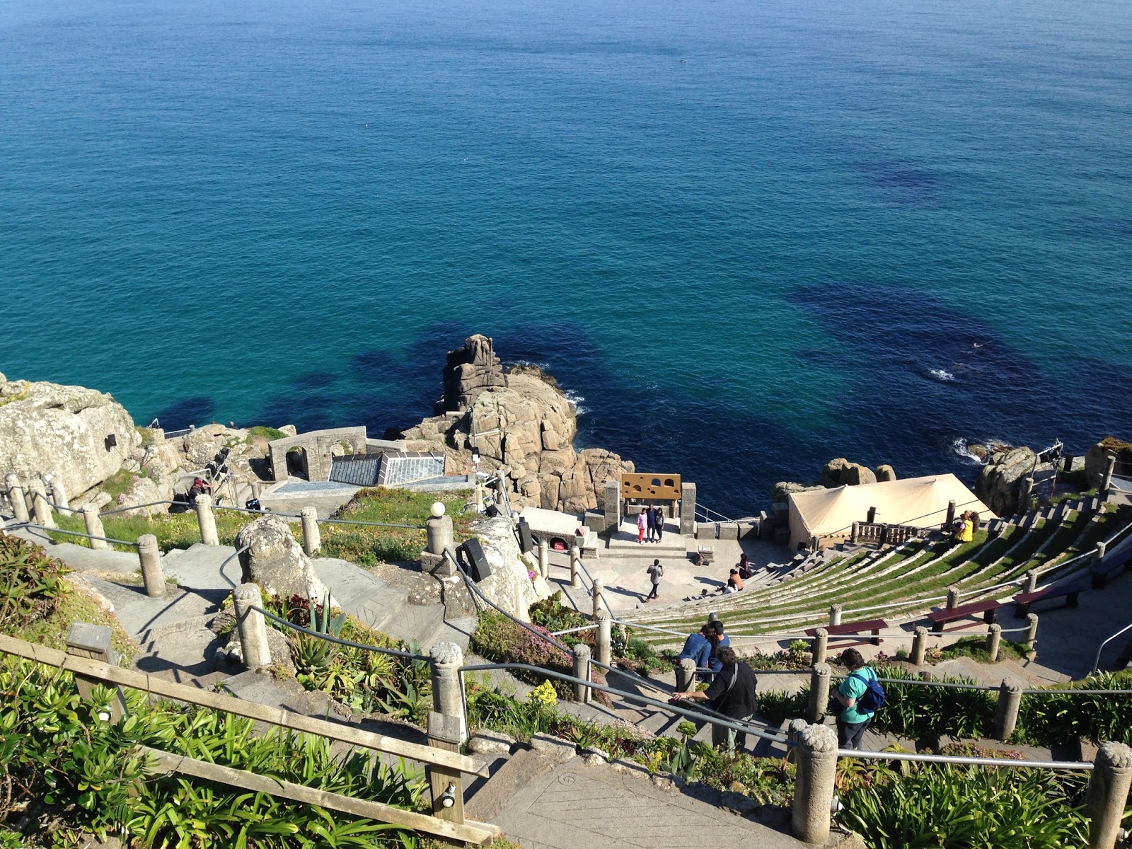 Friday, we headed out for our second big adventure, this time to Cornwall. We drove to Penzance, found our lovely little hotel right across the street from the water, which was perfection for our purposes. We then went a few miles down the coast to the Minack Theater, an amazing little open air theater built on a ledge overlooking the sea. It was truly one of the most beautiful places I’ve ever been, and the photos you’ll see in a minute don’t really do it justice. Soaring cliffs overlooked clear, turquoise water. Yucca plants and succulents were thriving along with the foxgloves and bluebells. We walked a little stretch of the Coastal Path out to the edge and read just relaxed to the sounds of the waves sparkling in the sunlight. I had my first ever Cornish Pasty (delish) and we got ready for our evening.
