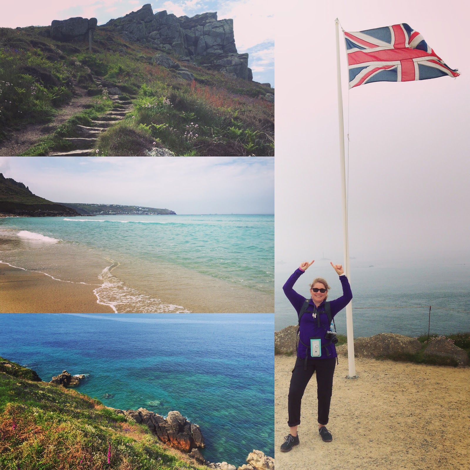 The next day, we got up early and headed to a little town called St. Just. We followed a trail out to the Coastal Path and spent the next 5 miles taking in more amazing views, fields of flowers, stone steps, and that amazingly clear turquoise water. We could’t get over how, if you forgot you were in England, it actually looked like the Bahamas. We did put our feet in, and it definitely wasn’t the Bahamas. Still gorgeous though. We walked all the way to Land’s End, which was a silly dream of mine, to stand at that farthest point on the map. We got to the end, the British flag was flying in the wild wind, and I was happy.