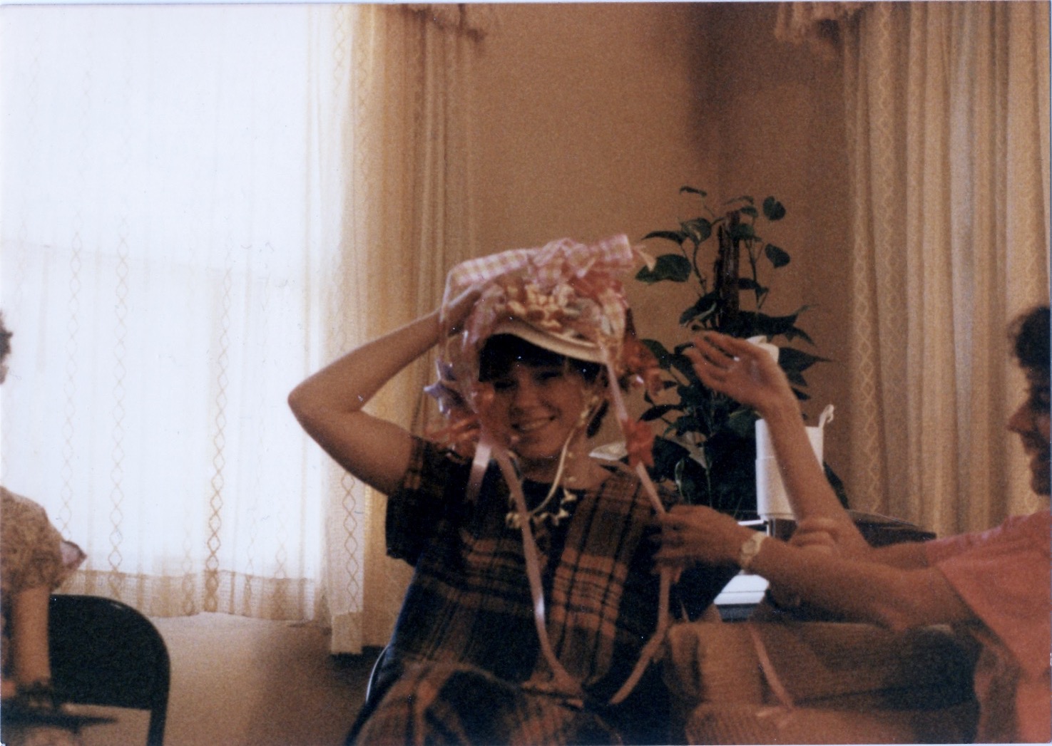 As I looked through these photos, I realized that the story is not about the party itself. It was a normal enough bridal shower– with lunch and a cake and yes, a bow bonnet. I remember none of the details at all, except that I borrowed the outfit I’m wearing from Valerie, the Belgian exchange student who was living at my parents’ house when I got married.