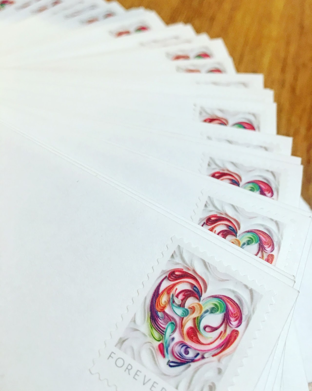 Anyway, the last couple of weeks have been concerned with, among other things, collecting, organizing, confirming and writing addresses of people we know. I designed the announcements, and I’m happy with the way they turned out. They are unique and reflect what Sara likes. We found perfect stamps with a quilled heart on them that Sara loves. We follow this lovely on Instagram and the stamps reminded us of her work. I took their engagement photos, and I’m honored that they allowed me to do that.