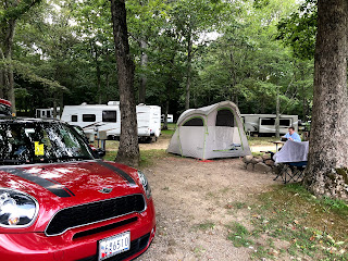 | Our campsite in Connecticut. It worked out great to camp, and the only real problem we had was with the 5 mph speed limit (it’s actually hard to keep from stalling going that slow in a manual) and that part on our brand new tent that broke the very first time we put it up. Fortunately, Bob, the awesome host of our campground, found us some zip ties. I had some duct tape and voila, a fix. So far, so good. The weather was perfect, with that lovely crispness one likes to feel when one is camping. |