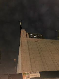 | The temple at night with that bright spot being the angel Moroni shining in the dark. It’s very well-camouflaged and fits in perfectly with the city, but still has the quiet elegance of a Temple. |