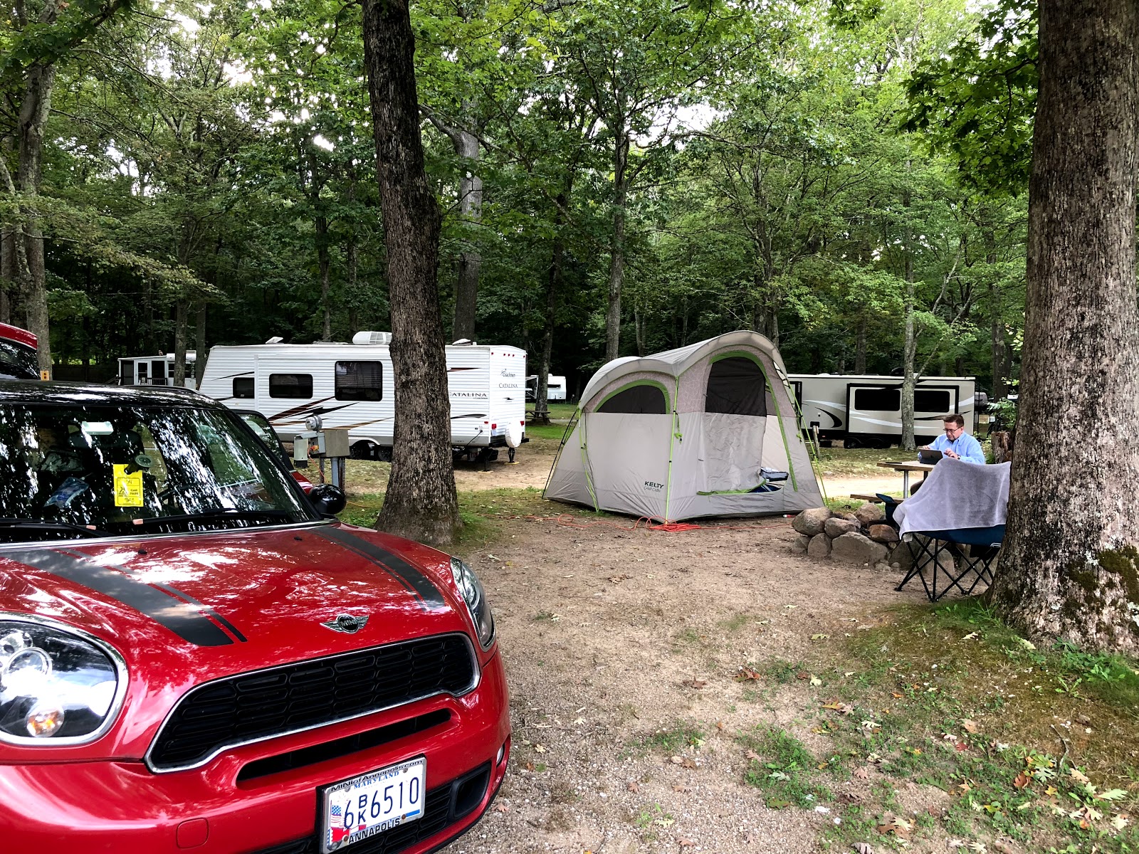 | Our campsite in Connecticut. It worked out great to camp, and the only real problem we had was with the 5 mph speed limit (it’s actually hard to keep from stalling going that slow in a manual) and that part on our brand new tent that broke the very first time we put it up. Fortunately, Bob, the awesome host of our campground, found us some zip ties. I had some duct tape and voila, a fix. So far, so good. The weather was perfect, with that lovely crispness one likes to feel when one is camping. |