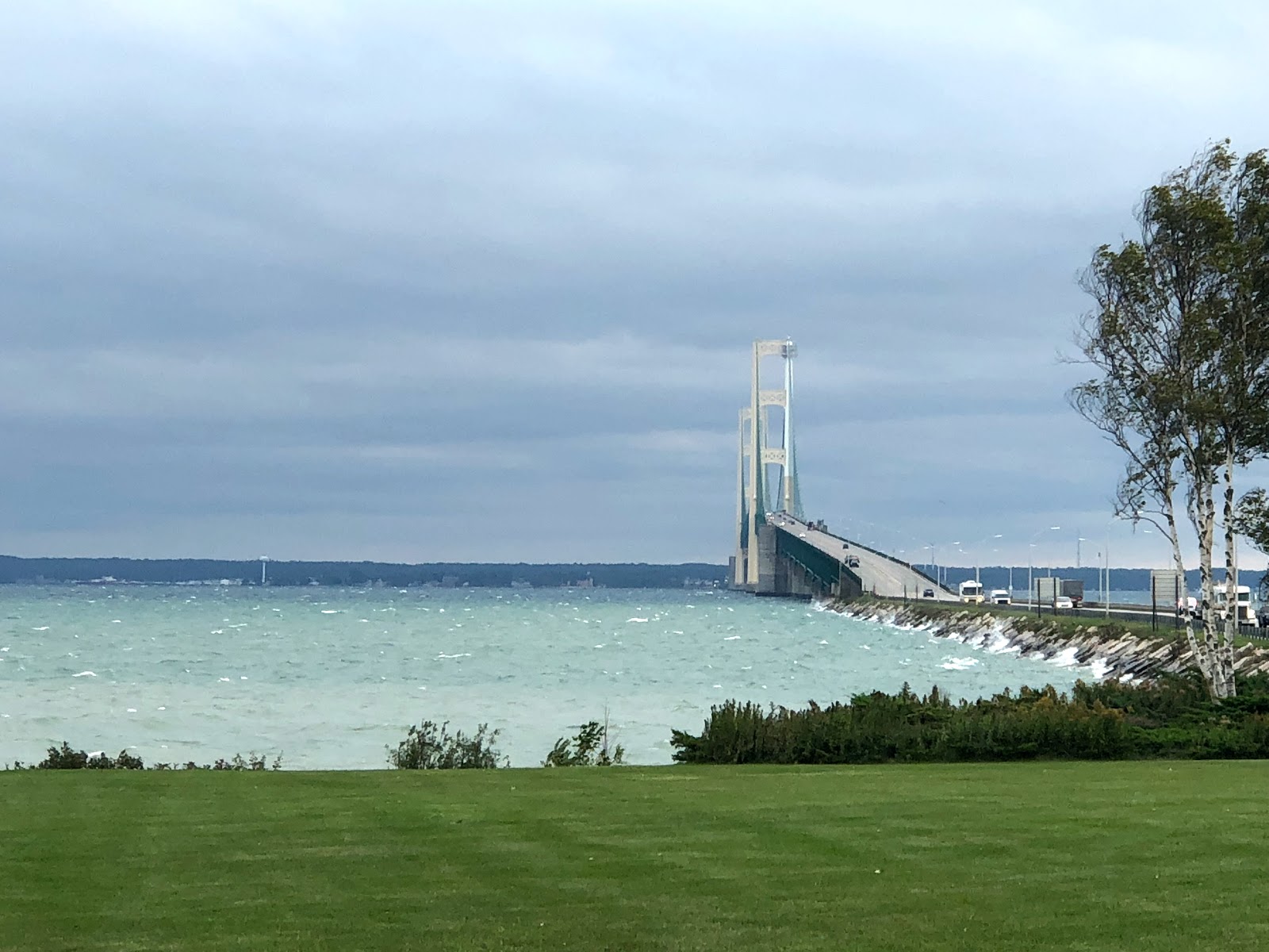 It was very exciting for both of us to cross the Mackinac Bridge, with Lake Michigan on one side and Lake Huron on the other. The bridge is really beautiful, and the straits themselves are quite dramatic.
