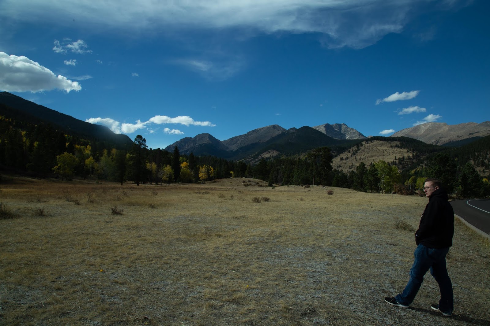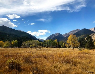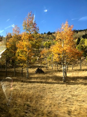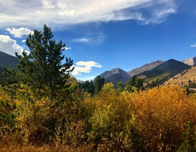 Sunday afternoon we went up to Estes Park and on a drive through Rocky Mountain National Park. I’d never been to either place and thought we might get to see some fall leaves and maybe a critter or two. Both dreams came true in abundance. The foliage was at peak and was just stunning. The mountainsides were a rich tapestry of all the colors of autumn, and the roadsides were ablaze with aspen, cottonwood, and more, all contrasting against the dark pines. It was exactly as I hoped.
