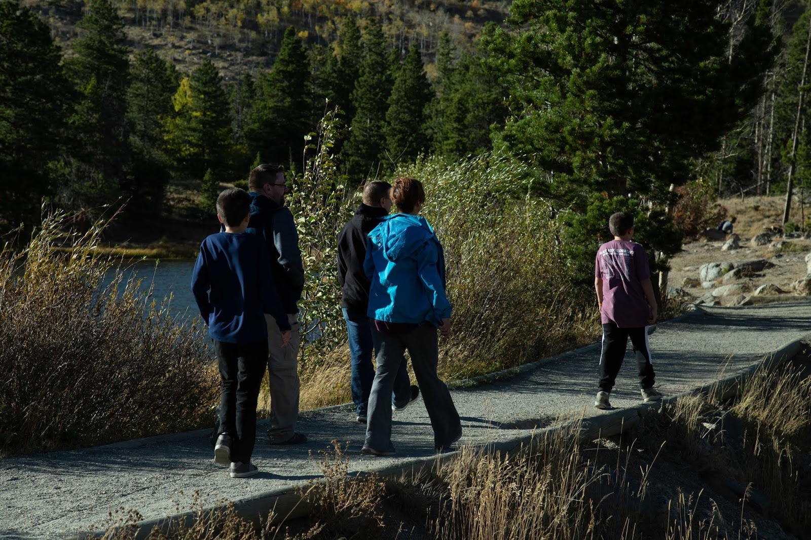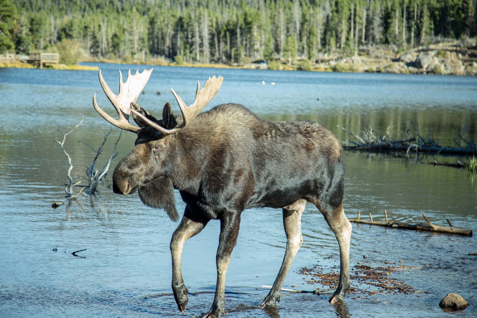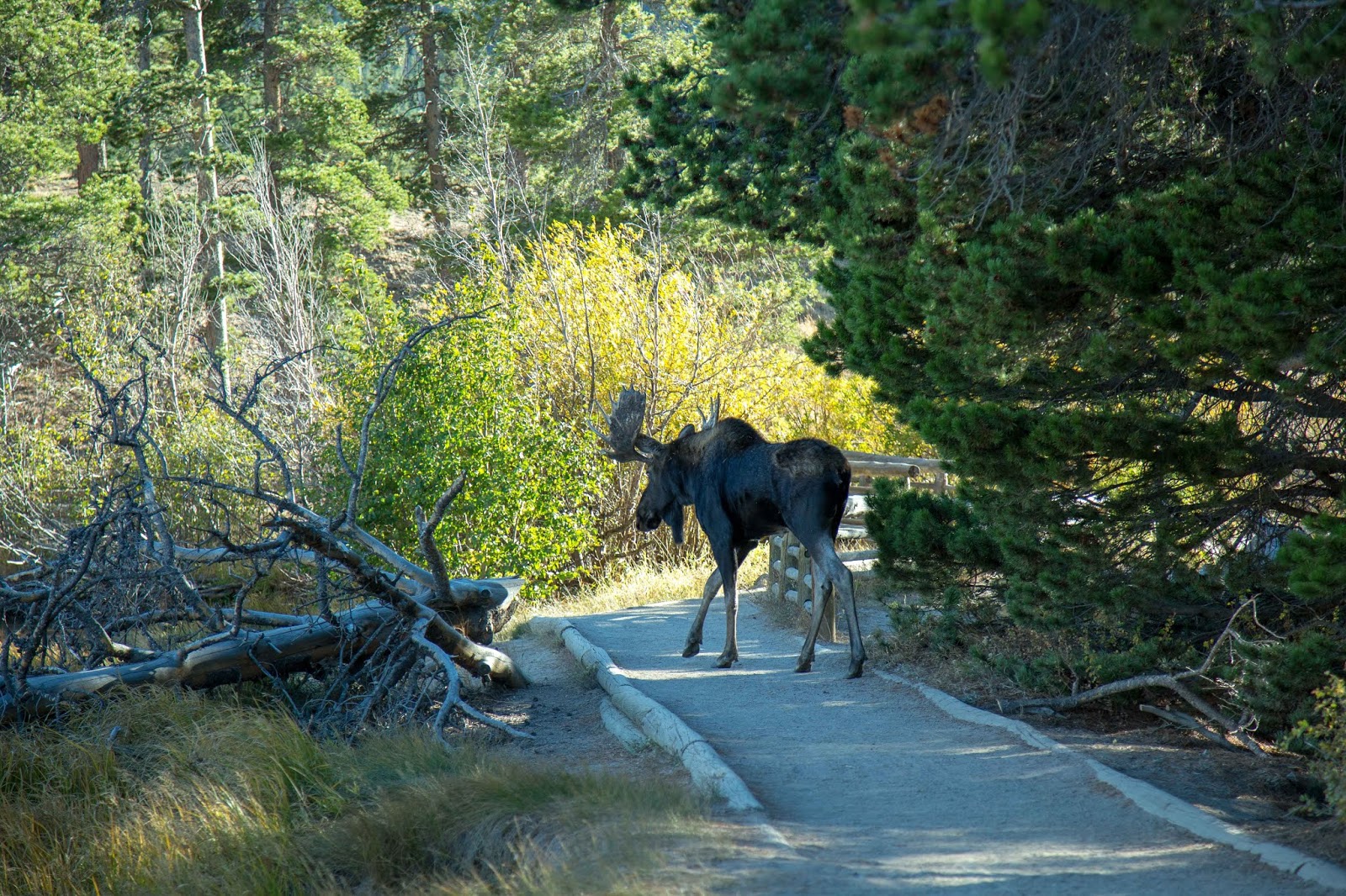 The drive through the park took us to a lovely walk around Sprague Lake. We saw perfect views of the mountains, lots of brook trout, some fat geese, and two astonishingly large bull moose who came out of the woods and wandered along the trail, had a tense standoff, and were generally not noticing the humans at all. We sure noticed them though, and all the people grabbed their cameras and tried to get all the photos. It’s my first time ever seeing a moose in nature, and they were impressive. Some of the people really didn’t seem to realize these animals could actually cause harm, and my brother cleared a few groups away from them. He’s such a good guy–careful and thoughtful, and I appreciated his willingness to get involved.